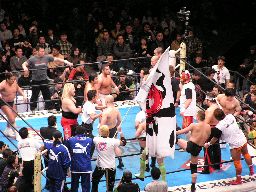 出場メンバーもルールも正式に発表されないままメイン開始。WJは長州筆頭に矢口、石井、宇和野の4人(+セコンド2人)。これが今のWJの全員だっけか。対するZERO-ONEはロウ・キー、日高、藤原組長までリングに。