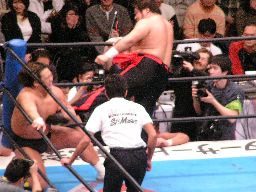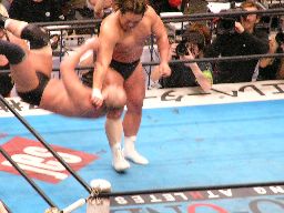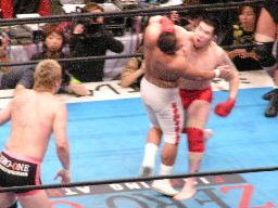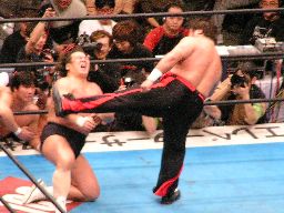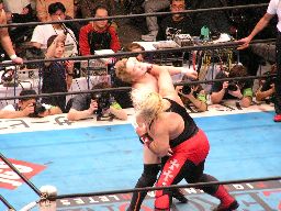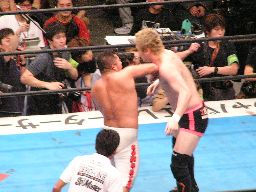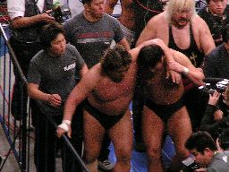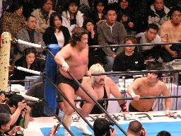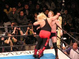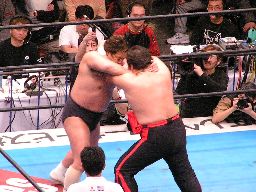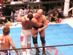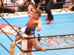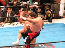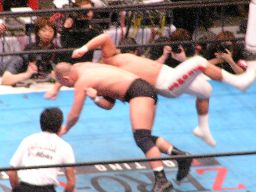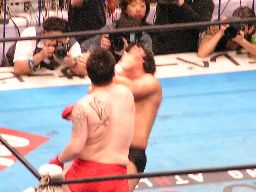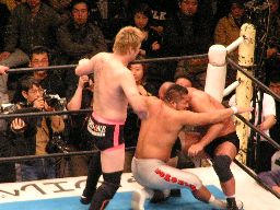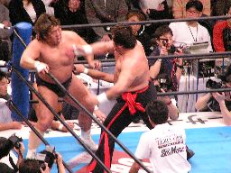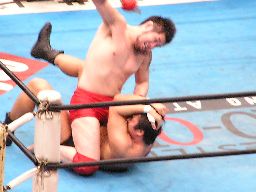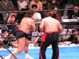 ロックアップでスタート(右写真)、しかし踏ん張りの効かない長州はあっさりコーナーに押し込まれる。