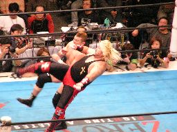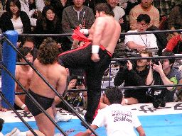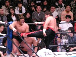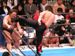WJの二番手は矢口。ZERO-ONE側は横井を押しのけて山笠Z"信介が。しかし矢口のニールキックを食らう(右写真)。