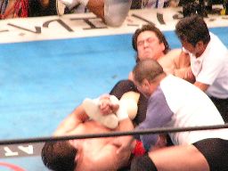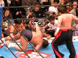 しかし後ろから佐々木がミサイルキックで強行参戦(左写真)。