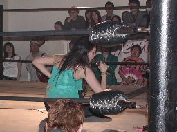 GENTAROシャープシューターに入ると見せかけて急所にキック。改めてシャープシューターに(右写真)。佐々木も入ってキャメルクラッチ。猪熊ロープ。5分経過。