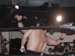 佐々木をロープに振る、佐々木カウンターのキックからバキューン!キック、続いてGENTAROがスウィート・チン・ミュージック(右写真)、カバーは猪熊がカット。ポイズンは場外に出てそのまま控室に。佐々木は猪熊にミドルキック、ソバット、カウント2。GENTARO入ってボディスラムからローリングセントーン、カウント2。