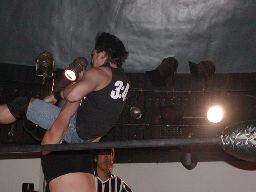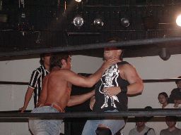高木が旋回式スタナーに行こうと宮沢を肩に担いだ時、場内にはライディーンが。そう来たかあ。もちろん維新力の登場。維新力は高木、高偽を次々にロープに振っての突っ張りで倒す(左写真)。