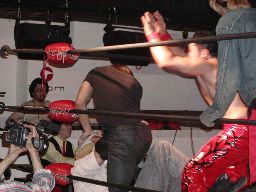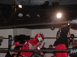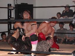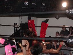 アカレンジャーズは猪熊を場外に出すとまだガウンを着たままのポイズンにダブルのすくい投げからハイファイヴエルボー(左写真)、猪熊が戻ってカット。佐々木がまた猪熊を場外に落とす。