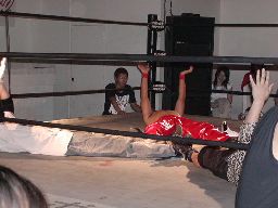 先生がリングに入りKUDOにモアイ・オブ・イースター(右写真)。先生は猪熊をKUDOの上に乗せる。カウント3。