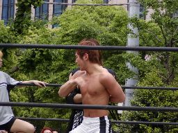 セコンドに付こうとする高梨を捕まえて服を脱がせるディーノ(左写真)「やる気満々じゃないの。」