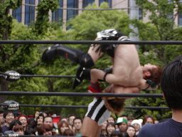 高梨後ろ向きにコーナーに上る。ムーンサルト?鳥羽が下からキック、MIKAMI雪崩式スクールボーイに(左写真)、ディーノがカットに入りついにMIKAMIもディーノの魔の手の被害者に。