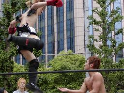 しかしまたディーノが入ると様相一変。ディーノはボディスラムからセカンドコーナーに上ると高梨に鳥羽の足を広げるよう指示。高梨足を広げるがディーノ不満足らしくコーナーから降りてダメ出し。最後には「もっとまんぐりみたいに!」と自ら広げてみせる。高梨その通りにする。ディーノはコーナーからダイビング男色クロー(右写真)。