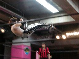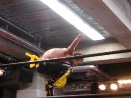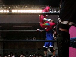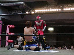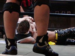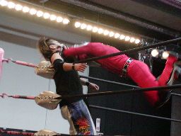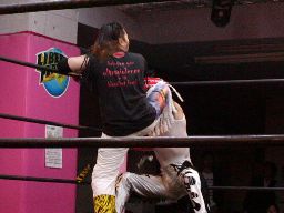 キッドはHERO!を捕え首投げからキャメルクラッチに取ると角に攻撃(左写真)。