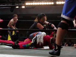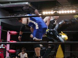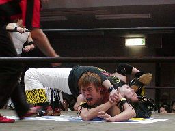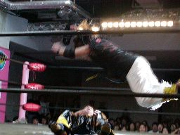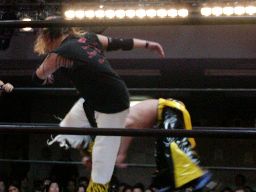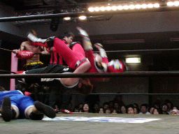 KUDOが橋本にミサイルキック、キッドがKUDOにフロッグスプラッシュ(左写真)、MIKAMIがキッドにミッキーブーメラン180。