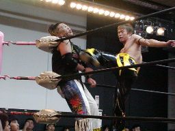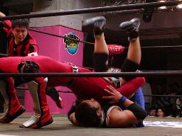 橋本ショルダースルー、カウント2。横三角絞め(左写真)、KUDOロープ。諸橋にタッチ。