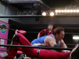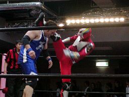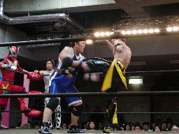 諸橋ニーリフト、チョップ連打。KUDOはキックで応戦(右写真)。諸橋バックドロップ、カウント2。諸橋チョップ、KUDOキャッチして逆上がりから逆さ押さえ込み、延髄蹴り打ち込んでMIKAMIにタッチ。10分経過。
