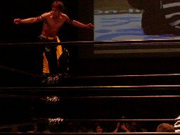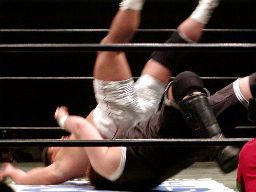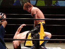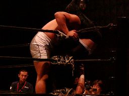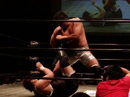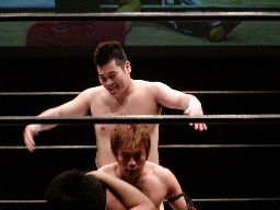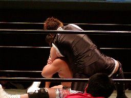 健心コーナーに振る、橋本待ち構えて突っ込んできた健心にキック、ロープ越しにぶらさがり三角絞め(右写真)。