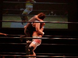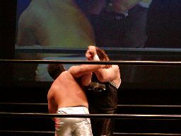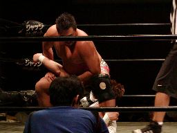 ロックアップ、ディーノヘッドロック(右写真)、KUDOロープに振る、ディーノショルダーブロックで倒す。