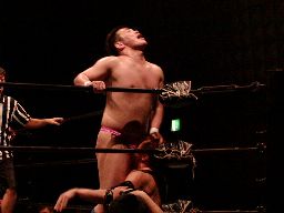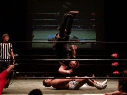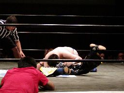 橋本バック取ると投げっ放しジャーマン(右写真)、健心すぐに立ち上がってもう一発ラリアット、ダブルノックダウン。健心が先に起きてカバー、カウント2。