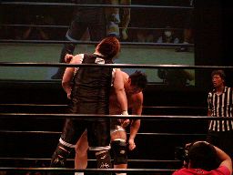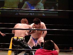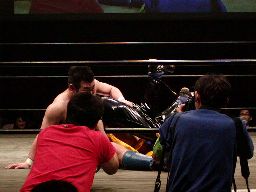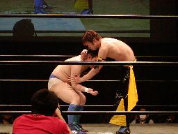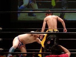 橋本ミドルキック、首投げからスリーパー(右写真)、リリースしてカバー、カウント2。橋本は健心を場外に放り出す。