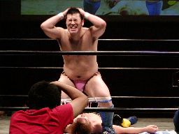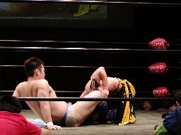 橋本エプロンに上がる、健心背後から足にラリアット。リングに戻るとサソリ固め(右写真)、橋本ブロックしてロープ。