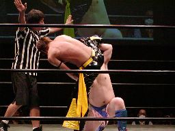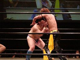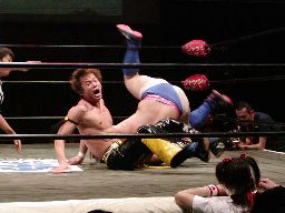 ディーノ腕をひねってエルボースタッブ、KUDO切り返してヘッドロックからフライングメイヤー、ディーノはヘッドシザーズに切り返す(左写真)。KUDO首を抜いてブレーク。