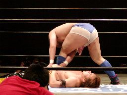 橋本突っ込む、健心パワースラム(右写真)、カウント2。