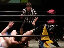 レフェリーがKUDOの腕を取って確かめる、KUDOカウント3で腕を上げる(右写真)。