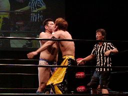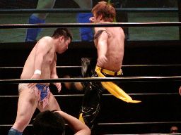 ロックアップ、健心ロープに詰める、ブレーク。これをもう一回。橋本ローキック、健心逆水平(左写真)。