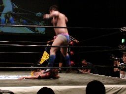 対角線コーナーに振ってダブルニーアタックからフィッシャーマンズスープレックスホールド(左写真)、カウント2。