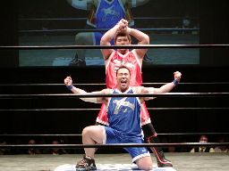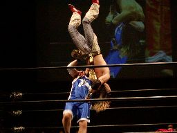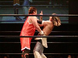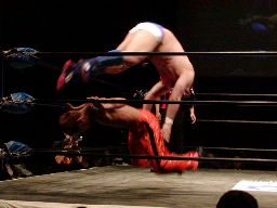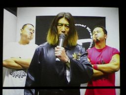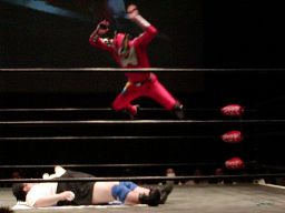 太はHERO!の足をキャッチすると抱え上げてターンバックルに、そしてオクラホマスタンピード(左写真)。スーパーフライに行くがかわされる(というか届かず)。