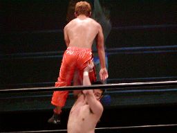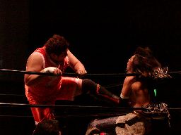 ディーノナイトメア(左写真)、高梨失神?ディーノはカウント2で引き起こす。ディーノロープに振る、高梨ダメージのため足がもつれる。ディーノストンピング。