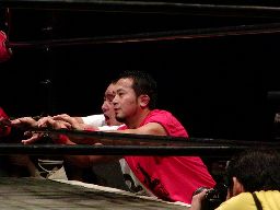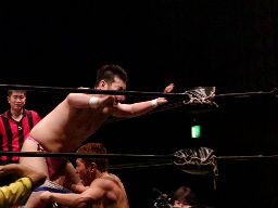 2人でロープを内側に押してロープエスケープを助ける。この2人の近くで見てた人たちは試合よりこの2人が面白くてしかたなかったに違いない。橋本はリリースしてストンピング、サッカーボールキック。