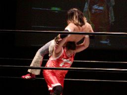 動きの止まった橋本に逆にチョークスラム(右写真)。そしてキャトルミューティレーション、橋本一旦はブレークしてドラゴンスリーパーに切り返すがポイズン体勢を元に戻すと再度キャトルミューティレーション、橋本ギブアップ。