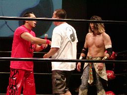 コーナーに詰めてキック、踏みつけ(左写真)。佐々木と猪熊が抗議する。