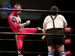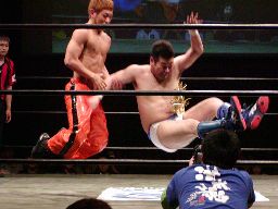 HERO!シャイニングウィザード、太ブロック。チョップの打ち合いから太は腹アタック連打。コーナーに振ってスプラッシュ。ライガーボム狙うがこれは回転エビ固めにHERO!切り返す。HERO!はミドルキック連打(右写真)。