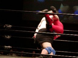 橋本十字(右写真)、ポイズンはレフェリーに呪文かける。佐藤レフェリー倒れこんで橋本にヘッドバットの形、これでブレーク。