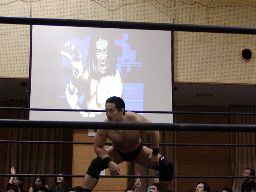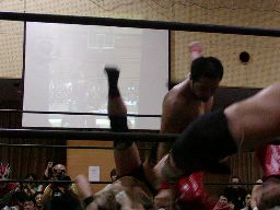5番目の入場は電ゲ偽ネットワーク(右写真)。早速ゴージャスにクラッカー攻撃。顔面踏み付け。