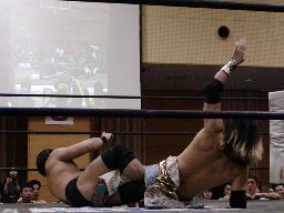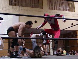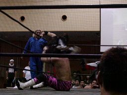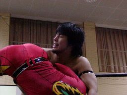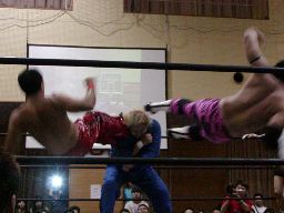 佐々木は高木をロープに振ってドロップキック(左写真)、カウント2。佐々木ボディスラムからギロチンドロップ、カウント2。コーナーに振る、高木突進をかわしてラリアット狙うが佐々木はカウンターのゼロ戦キック。佐々木ロープに飛ぶ、高木カニばさみで倒してヒップドロップ、HERO!にタッチ。15分経過。
