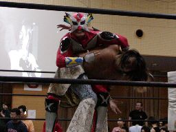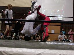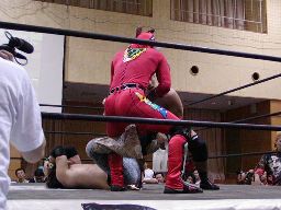 無理矢理起こしてもう一発スタナー、見事な吹っ飛びを見せるクマ戦闘員(左写真)。