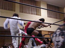HERO!はポイズンをコーナーに振ってクロスチョップ、ポイズンをオーバーザトップロープで落とそうとする。そこに6番目入場のGENTARO、教祖を救うと逆にHERO!を落としにかかる(左写真)。高木が救出。GENTAROは高木をロープに振ってドロップキック、2人場外に。