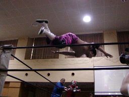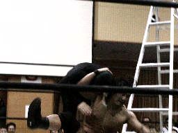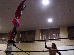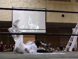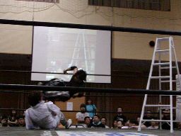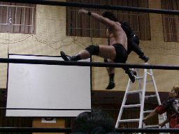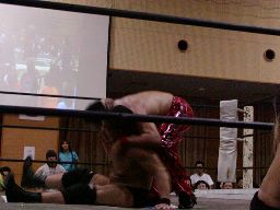 MIKAMIは佐々木にムーンサルトアタック(右写真)、ラダーをコーナーに立てかける。佐々木をコーナーに振るが佐々木切り返してMIKAMIがラダーに激突。佐々木リバースDDT、ゴージャスにタッチ。