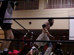最後の入場は佐々木。水を口に含んだ一宮にパンチ(右写真)、一宮観客席に放水。佐々木は高木にゼロ戦キック、サッカーボールキック、ギロチンドロップ、カウント2。GENTAROにタッチ。