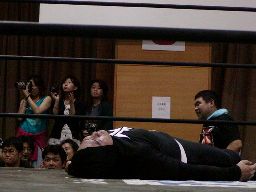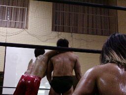 MIKAMIミッキーブーメラン180をゴージャスの顔面に叩き込む(右写真)。MIKAMIラダーに上る、佐々木がドロップキック、MIKAMIエプロンに落下。一瞬ホッとしたところに佐々木がゴージャスをMIKAMIにぶつける、MIKAMI転落。