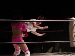 「昭和」子コーナーに振る、チェリー切り返して串刺しドロップキック。チェリーは首投げで座らせてドロップキック5連発(右写真)、カウント2。
