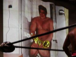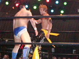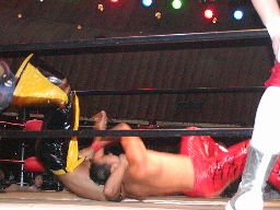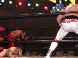 KUDO泣き顔で引きずられていく。ディーノはKUDOをコーナーに振ると四つんばいになって「いつもGENちゃんとやってるように、さあ!」と尻を高く突き出す。佐々木はその尻にドロップキック、ディーノは顔面からKUDOの股間に突っ込む(右写真)。ある意味思いどおり?