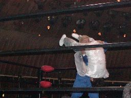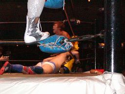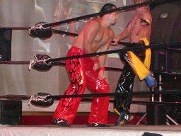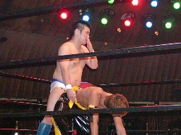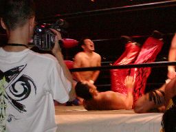今日は違うかと思ったら首投げから「死ね〜」(左写真)。KUDOロープ。