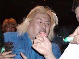 ディーノマイク。「はー、急造タッグって言っても何とかなるものね。やっぱりそこに愛があるから?照れなくってもいいのよ。前からあなたとGENちゃんの、スウィート・チン・バキューン!な関係、いいなって思ってたのよ。だからってすぐにどうこうはしないから今日は握手しましょ。」とさっきまで股間に入れてた手で握手。佐々木応じる。すっかり無防備。