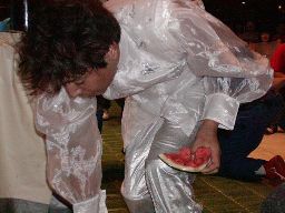 一宮ゴージャスをロープに詰めて逆水平、助走を付けてラリアット、ゴージャスかわして一宮場外転落。ゴージャスは一宮の頭にスイカを落とす。かけらを拾うゴージャス(右写真)。
