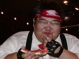 一宮の救出に入った太だが、ゴージャスにスイカの切れ端を渡されると喜んで頬張る(左写真)。ゴージャスはリングに戻るとフライングクロスアタック、カウント2。ゴージャススープレックス狙うがこれは上がらず。するとゴージャスDDTにスイッチ。やるじゃないか。ゴージャスコーナーに上る、一宮立ち上がって顔面にクラッカー攻撃。