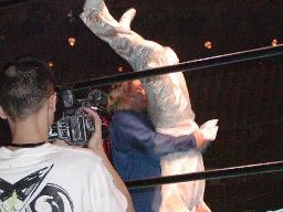 いきなりリングにはブルーシート、そして観客には「各テーブルに置いてあるビニールシート(ゴミ袋)を準備するように」とのアナウンス。何が起きるのだ?一宮を客席で急襲したゴージャス、しかしすぐに反撃を浴びる。一宮は客席を引き回す(左写真)。