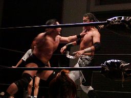 猪熊を呼び込んでダブルのフラップジャック(左写真)、猪熊カバー、カウント2。猪熊ストンピング、柿本立ち上がってエルボー、猪熊はチョップで対抗。猪熊はダブルチョップで倒してカバー、カウント2。石川にタッチ。