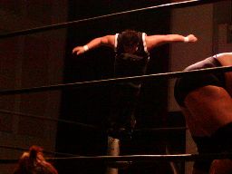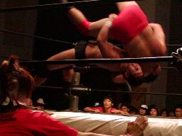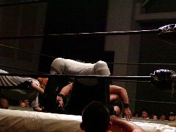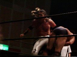柿本コーナーに振って串刺しエルボーからカーフブランディング、コーナーに上ってダイビングショルダーブロック、カウント2。バック取るとジャーマン(右写真)、これも2。高木にタッチ。