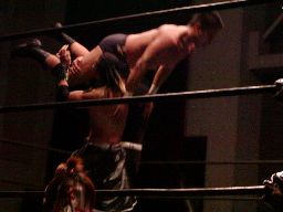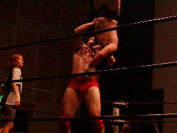 柿本エルボー連打からロープに振ってドロップキック、ポイズンスカす。ポイズンラリアット、柿本かわしてアームホイップ連発。アームロックに取るがポイズンはサミングでブレーク。ポイズンロープに振ってキチンシンク(右写真)、ストンピング。